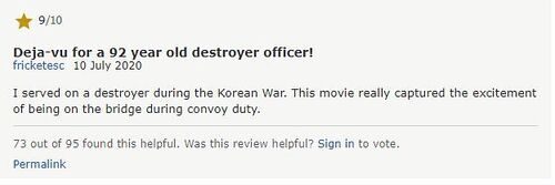 最后总结一下,《灰狗》在描述驱逐舰指挥官所处的环境和岗位方面,对应我能找到的关于美国二战驱逐舰舰桥执勤的回忆著作,是高度符合历史的。虽然缺乏背景介绍会让观众一头雾水(我觉得每个人物出场时打个标签还是可以的),但这种克制而准确的表达,也可以说是一种自信的表现,尤其当我考证完之后,也就越发感叹其用心之精良了。