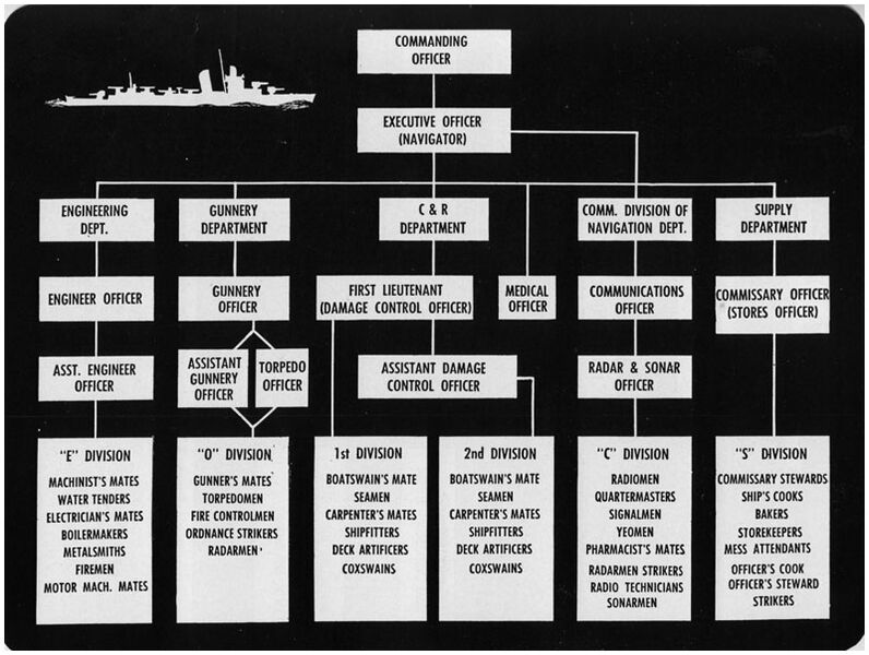 二战美军驱逐舰的典型组织结构与指挥链,如下图所示。该图出自1944年6月美海军的一份标准课程教材。