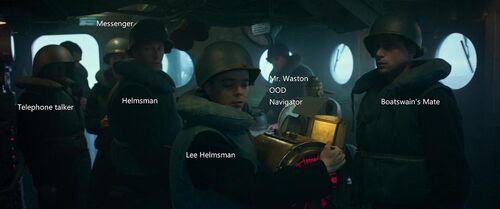 只是,我在电影的演员表里发现,演员表把掌舵的所有演员都叫helmsman了,也不能确定电影表现的舵手到底是哪一种,所以在图里也就这样标了。其实helmsman属于sailor,quartermaster则是enlisted officer,要高一等。这算是一个小纰漏吧。