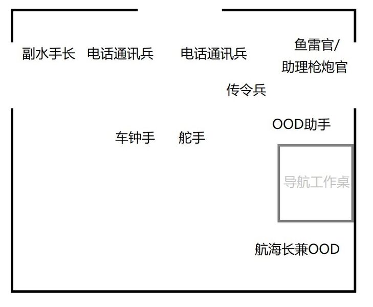 OOD有自己的工作位置,就是上面画的导航工作桌或者叫航海工作桌,桌上堆着海图、日志、尺规等。毕竟值班官最重要的工作就是确保军舰安全、正确的航行。他有一个助手帮他看海图、规划航线、做记录,职务叫quartermaster。(按:这个词我不知道中文为什么要翻译成军需官,其实是源于风帆时代,在当时的指挥所所在的后甲板Quarterdeck围着指挥官转的那些岗位。)