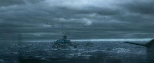 小说里击沉的第一艘潜艇就是电影里开头20分钟所追踪的那一艘,只是它并没有像电影里那样被成功击沉,而是靠钻船底躲掉了基林号的攻击。不久后,基林在返回船队途中又遇到了它,并召唤波兰驱逐舰闪电号(电影里的鹰号)加入攻击,最后在轮番投弹中,由基林号将其炸毁了。