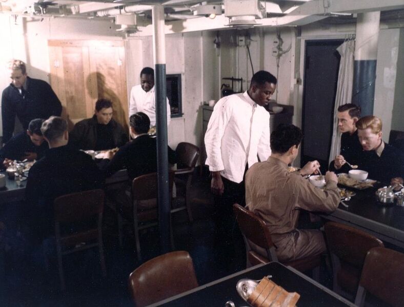 一个例子是片中对黑人角色的处理,原著小说中对此毫无着墨,根本看不出牺牲的厨子是黑人。但是在当时的美国海军,黑人当厨子确实是普遍存在的现象,而当水兵乃至军官则是到战争后期才零星出现的事。即便是为了政治正确而加入一个黑人角色,其形象,地位都是很有历史质感的,对这个角色的简单刻画也能让人留下比较深的印象。
