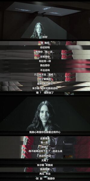 初次视频连线,也是全片唯一的一次视频连线对话内容,第一次看有点一头雾水,看下去被情节误导以为是女主不愿活在虚拟的死后世界,不愿再与男主进行对话。但你看完回过头来细品,其实知道反转后,这段对话也完全成立。也就是说这台机器是真实世界中有的,同时这次对话也是在真实世界中存在的,是当时女主想要放下过去,跟男主进行的最后告别。