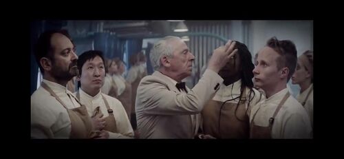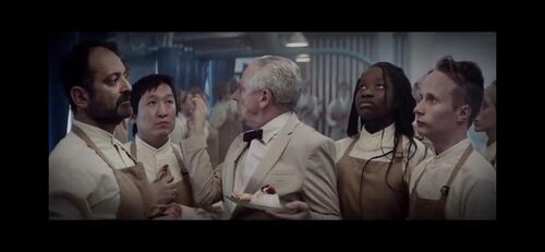 (当然有人会质疑,厨师长怎么会这么天真?难道他这么久都没见过平台的血污粪便之类吗?在影片中,有一个侍者端着食物放上去的镜头,厨房本来就只负责食物出品,将食物送给客人以及收拾用餐后的桌椅本就不是他们的工作。况且见识过平台的话,还费那般功夫将食物做的精美无比又有什么意义?)