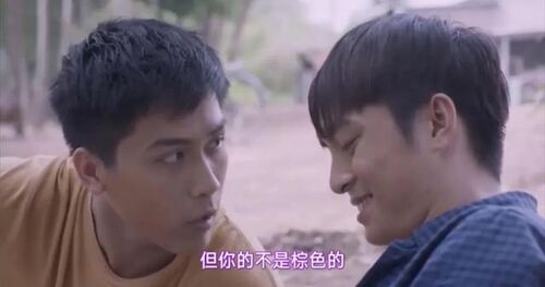 又如两人骑车至野外,席地而坐,讨论起“阿棕”小名的由来,“这里的人把每个孩子叫做‘Cu’(棕色)”,阿文听后却打趣道,“但你的不是棕色的”。