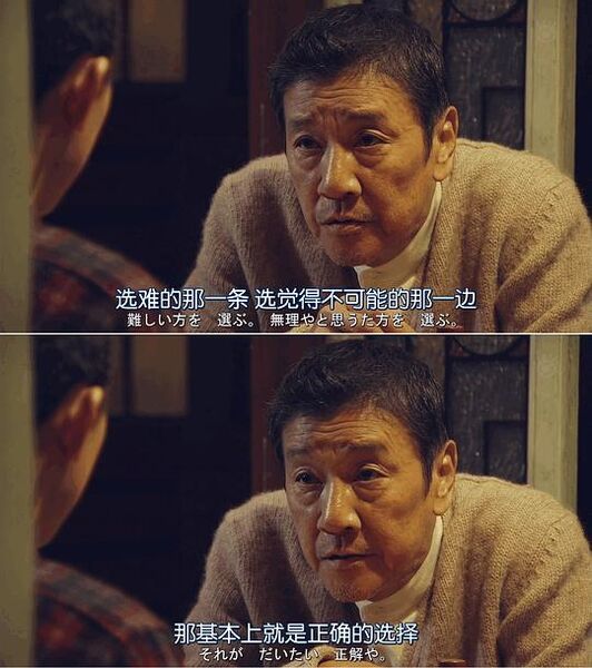 【热情】「殺すつもりやなかったんやろ?正当防衛なんやろ?(你不是故意杀人的吧?是正当防卫吧?)」——渡辺拓海在这个故事中,第一件深刻震撼马场纯人生的事,可以说是弟弟的患病,可以说是自己过失杀人,但是更应该是在他被收留到德田保育园后室友渡边拓海所说的这句话。逃狱后,经历了弟弟的死亡,一时间也尝试结束自己的生命。即使德田先生给了他一个暂时的容身之所,可是这样的纯依然处于担惊受怕、深度自责的困境之中。借由拓海创造的剪头发场景,两人一前一后,纯可以不直面他人倾诉自己的罪行。令人惊奇的是,没有听说过案件细节的拓海像是名侦探一样,很自然地说出了真相。人在面对无尽的指责谩骂之时,可以逆来顺受坚韧到底;唯独面对袒护自己的只言片语,脆弱得无法承受。明明是才认识不久的人,竟然可以这般看穿自己,原来从逃狱出来这段短暂又漫长的黑暗时光里,仍有人试着了解自己、相信自己。当这束安慰的暖光照进来的时候,泪水咆哮决堤。