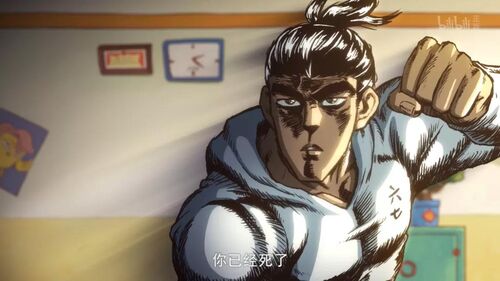 例如把其他动画拿来尽情恶搞——(年轻小的朋友可能不认识下面这句台词出自著名的《北斗神拳》)