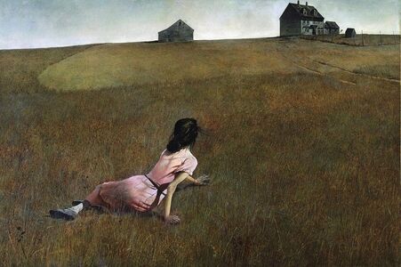 “1948年的代表作《克里斯蒂娜的世界》使怀斯(作者)成为家喻户晓的写实画家。作品描绘的是患小儿麻痹症的克里斯蒂娜·奥尔森拖着身子,用腰部以下的肢体在美国缅因州广袤的玉米田中爬行的背影,所呈现的孤寂与坚强让世人备受感动。”(节选自《典藏:经典世界名画高清图集》人民邮电出版社)