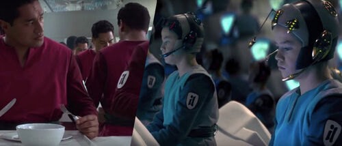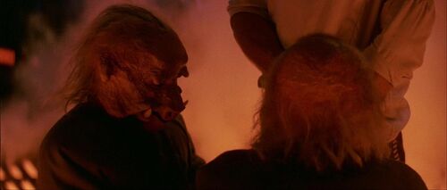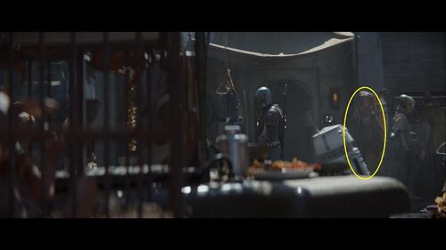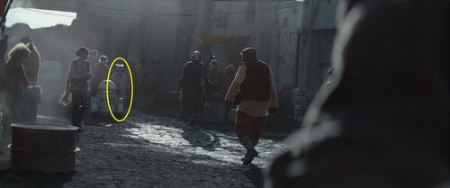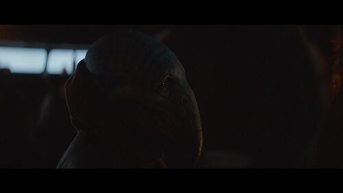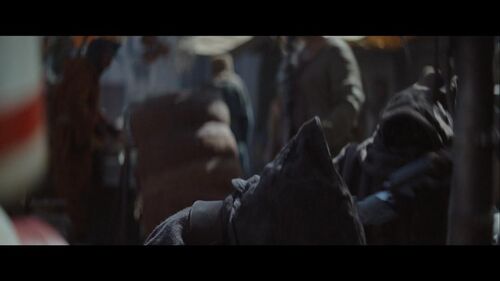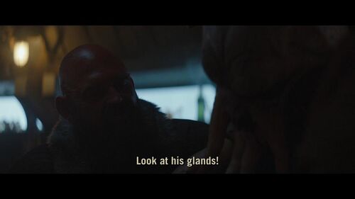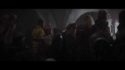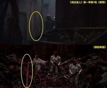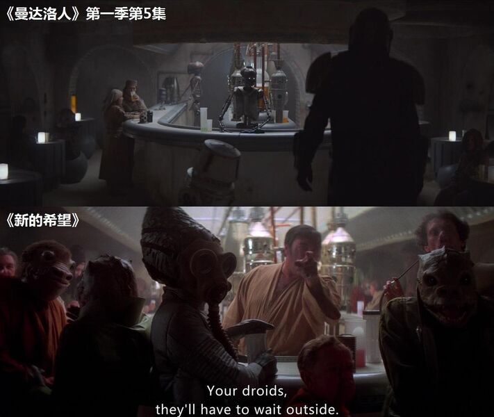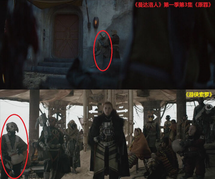 在这个场景的近景处,可以分别看到梅尔布人(Melbu)和久藏人(Kyuzo)。梅尔布人最早出自《游侠索罗》;久藏人最早出自2010年的动画连续剧《克隆人战争》第二季第17集《赏金猎人》。