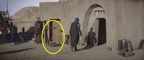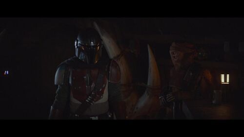 这家小酒馆被称为“查尔蒙小酒馆”(Chalmun's Cantina),因其所有者是伍基人查尔蒙而得名。它最早出自《新的希望》,卢克和汉·索洛就是在这里认识的。主角在35号泊位表现出了对机器人的厌恶。这很可能源于他的父母是被机器人杀害的。而在《新的希望》中,当时的查尔蒙小酒馆日间酒保伍尔(Wuher)也非常讨厌机器人,因为他的父母也是在克隆人战争中死于机器人之手。但讽刺的是,九年后,查尔蒙小酒馆的酒保被换成了两个EV系列监管机器人(EV-series supervisor droid)。其中接待主角的就是EV-9D9——她最早出自《绝地归来》,在贾巴的宫殿里当机器人监工。值得注意的是,在本集为她配音的演员是卢克·天行者的扮演者马克·哈米尔。