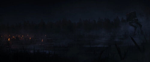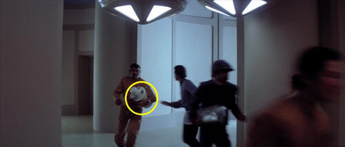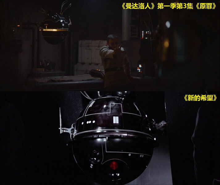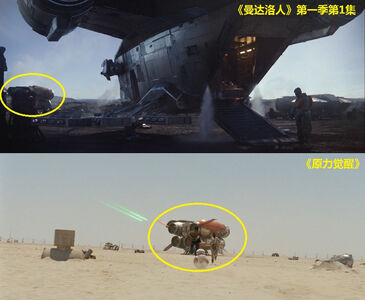 在这个场景里,屏幕左下角有一个R5系列宇航技工机器人(R5 series astromech droid),该型号最早出自《新的希望》。在屏幕中间有一个A-LT多功能机器人(A-LT Utility Droid),这是为2016年的《侠盗一号》创作的机器人型号。