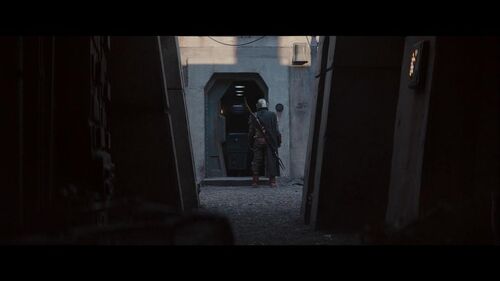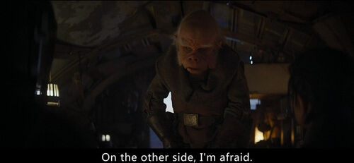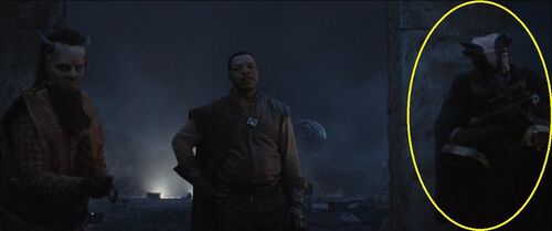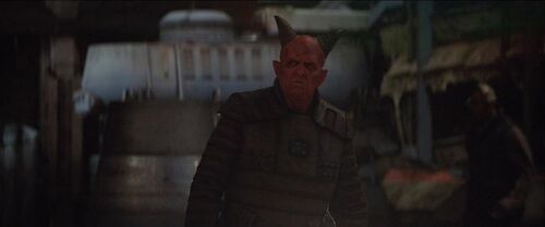 在这个场景里,屏幕右边有两个对话的特兰多沙人(Trandoshan)。特兰多沙人是《星球大战》作品里的常见种族之一,最早出自《帝国反击战》。罗迪亚人在这个场景里又出现了。
