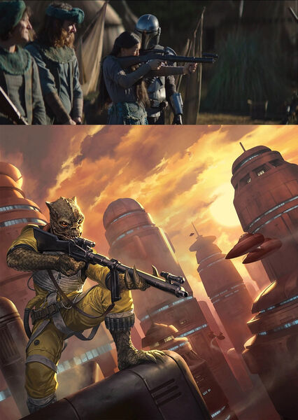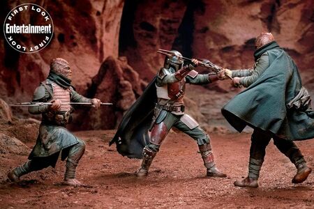 本集开头那场打斗的剧照先前被美国《娱乐周刊》独家公布过。主角的敌人是三个特兰多沙人(Trandoshan)——这个种族在第1集出现过。特兰多沙人发源于卡希克星系(Kashyyyk system)的行星特兰多沙(Trandosha),与伍基人(Wookiee)是邻居,但这两个种族关系很差。特兰多沙人特别喜欢当猎人。在《帝国反击战》中,为了追捕“千年隼号”,达斯·维德雇了一群赏金猎人,其中就包括特兰多沙人博斯克(Bossk)。