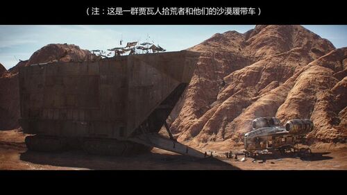 贾瓦人(Jawa)和他们的沙漠履带车(Sandcrawler)最早出自1977年第一部《星球大战》电影,即《新的希望》。沙漠履带车是贾瓦人的住所、交通工具和废品处理厂。沙漠履带车最早是被采矿者带到行星塔图因的。但当塔图因的采矿业被证明不需要沙漠履带车时,它们就被矿工们遗弃了。结果,当地的贾瓦人回收了这些履带车,把它们变成贾瓦人文化的重要组成部分。值得注意的是,卢卡斯影业在新加坡的办公大楼就采用了沙漠履带车的造型: