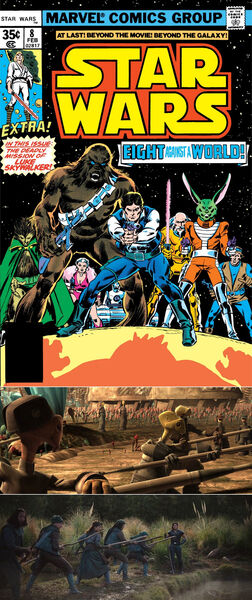 这已经是《星球大战》作品第三次致敬《七武士》了。第一次是漫威漫画在1977年11月到1978年1月出版的漫画《星球大战》第8~10集。在阿杜巴3号行星(Aduba-3),汉·索洛、丘巴卡、贾克森(Jaxxon)等8人要保护奥纳克拉村(Onacra)免遭“云骑士”(Cloud-Riders)匪帮的劫掠——没错,《游侠索罗》里的“云骑士”就是以这几集漫画里的同名匪帮为灵感来源的。第二次是2010年动画连续剧《克隆人战争》第二季第17集《赏金猎人》。在费卢西亚,阿纳金·天行者、阿索卡·塔诺、恩博(Embo)等绝地和赏金猎人要保护明村(Akira)免遭杭多·奥纳卡及其海盗的劫掠。“明村”就是以黑泽明的名字命名的;恩博的种族久藏人(Kyuzo)就是以《七武士》中的角色久藏命名的。《曼达洛人》第1集和第3集也都出现过久藏人。漫威的古早漫属于传说;《克隆人战争》和《曼达洛人》都是正史。