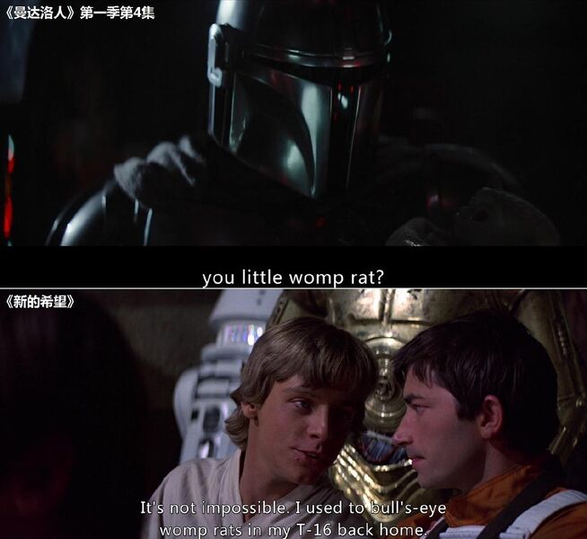 旺普鼠(womp rat)最早在《新的希望》中被提及,是塔图因的一种啮齿动物。卢克之所以能在摧毁死星的战斗中一发入魂,一方面是因为原力强大,另一方面就是因为长期用T-16跃空机射击旺普鼠大大强化了他的射击精度。