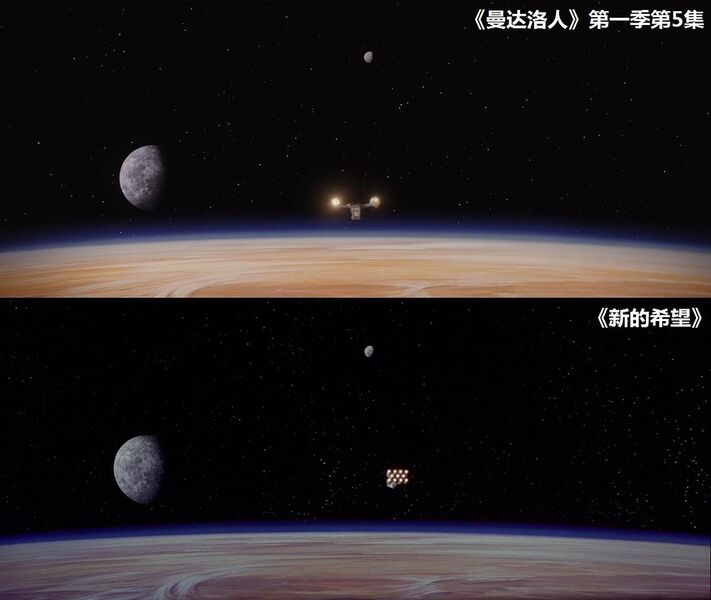 这个镜头和《新的希望》的第一个镜头一模一样。镜头里出现的两颗卫星分别是戈姆拉森(Ghomrassen)和盖尔梅萨(Guermessa)。塔图因其实有三颗卫星,第三颗卫星舍尼尼(Chenini)因为距离较远,没有在镜头里出现。