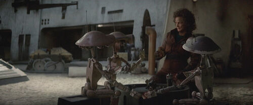 这种机器人是DUM系列维修机器人(DUM-series pit droid),最早出自《幽灵的威胁》,主要负责维护飞梭赛车(Podracer)。在上面这个镜头里,它们在和泊位管理员佩莉·莫托(Peli Motto)玩萨巴克牌,其中两个机器人还在暗中换牌。