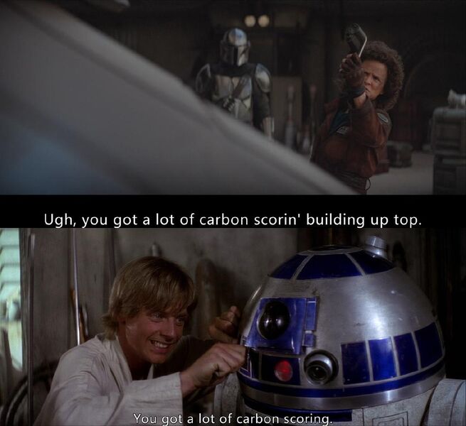 “碳痕”(Carbon scoring)是《星球大战》专有名词,最早出自《新的希望》,是指金属表面被气体烧灼后留下的痕迹。