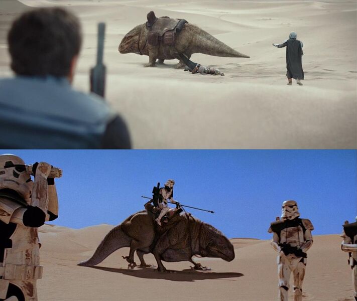 塔斯肯袭击者身边的动物是班萨(bantha)——银河系最常见,用途最广的动物之一。塔斯肯人和班萨最早出自《新的希望》。