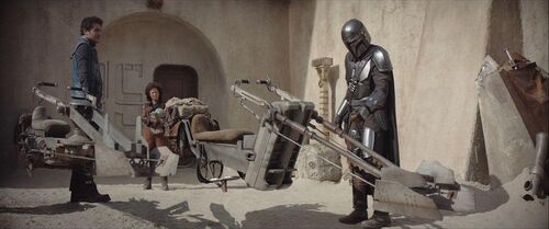 这两辆是“微风-J”(Zephyr-J)飞行摩托,由莫布奎特飞梭摩托与陆行艇公司(Mobquet Swoops and Speeders)制造,是本剧原创载具。