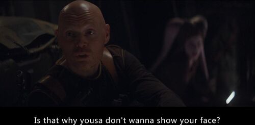 梅费尔德(比尔·伯尔饰)在这里模仿冈根人说话,把“you”说成“yousa”——这是冈根基本语(Gungan Basic)的口音特征之一,我们可以在《幽灵的威胁》中听到冈根人全都这么说话。