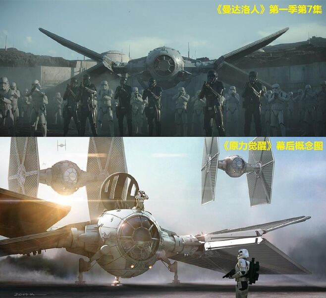 这是一架外域TIE战斗机(Outland TIE fighter),先前没有在其它作品里出现过,但其造型源于《原力觉醒》的幕后概念图。