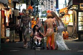 我在其他的报道中看到有说导演您亲自坐上轮椅去体验HIKARI:是的。当然有当然有。在大阪和东京。东京坐了2天吧,大阪差不多也是2天。大阪和东京真的完全不一样呢。在大阪是坐在轮椅上移动,要摔倒那一瞬间,就有大妈们围上来跟我说“大闺女,没事儿吧?”我就回答说没事没事。就这样被很多人帮助,我就想大概大阪市不存在所谓“障碍”的吧。所谓的“无障碍”应该就是说这种情况吧,很热情。到东京果然就没有这种事了。不小心碰到别人,人家就会“切”一声对我凶。在满员电车里边还会被侧目。这些经历其实之前在采访中都有听说,因此我有种原来如此的感觉。与此同时,实际坐在轮椅上,会感觉到直升电梯很少,觉得在这样的东京没法住。(东京的车站里各种电梯应该是都比大阪少。)很少。你去新大阪站或者大阪站的时候,会发现到处都有。东京没有吧,都是楼梯,不知道要走去哪才找得到电梯。通过这样的体验,实际感受到她们的心情,有些东西通过实际去体验才能感受到,比如在视觉上、自己目光的高度这些。我以前就想知道她们的视线是怎样的。这要是在大阪就不成立了。不是大阪,而是在东京的这种活着不自在的感觉,还有到处都是熙熙攘攘的人群的感觉,这方面让我选择了东京。
