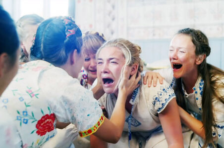 理解了这点就不难解释为什么当Dani跳舞的时候,她说不知道为什么可是我能懂你们的语言了。事实上从那一刻起,她就“共情”了同这里的人建立起联系了。各种草药无疑帮助了这种共情的产生,而她脆弱的内心也从某种意义上促进了她接受这种能力。因此反观电影里那些“你快乐所以我快乐,你痛苦所以我痛苦”的场景,他们的情感是真实的。这也一定程度上解释了为什么这个村子里有自愿自杀者。因为他们相信无论谁死,所有人都将体会到同样的痛苦。这也让电影最后一幕显得格外震撼。这可以理解为这是这个群落里的人长期具有的能力,这样一种联系显然是超越介质的。可究竟这种情绪是真实存在的,还是这些人经过长期洗脑如条件反射一般的反应,对于这一点是见仁见智的。所以说对于电影是否有超现实的部分,导演的态度是十分的隐晦和暧昧。