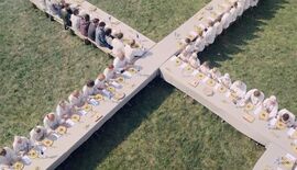 这个符号在电影中大量出现过,最明显的就是他们吃饭时候坐座位的排列的样子。这个符号根据Aster讲来源于几百年前流传下来的古瑞典的邪教传统,用来保护家庭家产等意义。因此它大量的出现在电影中的装饰上,并且座位也安排成Odal的样子。如下图:
