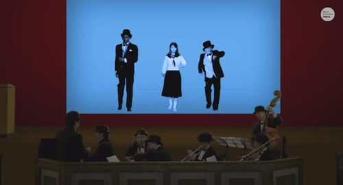 场景的拼贴间隙被大林宣彦以大量个人的风格元素填充——各种色彩和形状的画框、反复变换的彩色滤镜、浮夸的绿幕特效、不自然的动作衔接和镜像错位;加上人物在各个历史场景的违和乱入与不断出现的字幕注释。