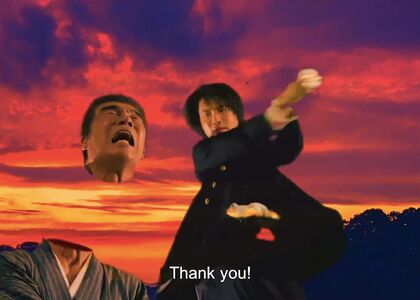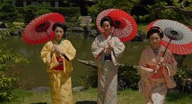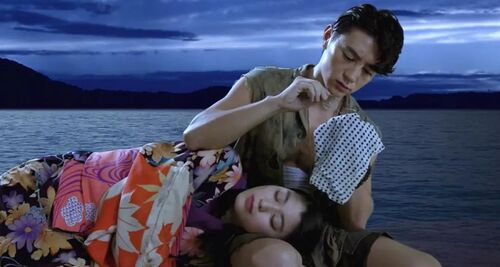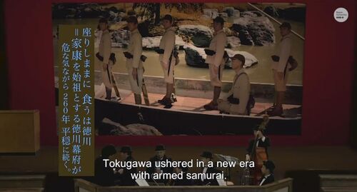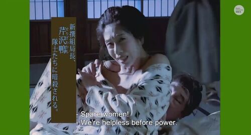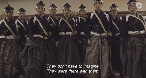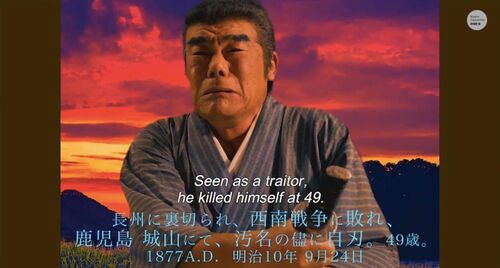 伴随着歌舞段落联结了不同时空,一场几个年轻人与日本战争电影的马拉松之旅被打响——影片的前半程,大林宣彦密集地以不同历史场景编排,像是带观众跳跃式领略了德川家康的幕府时代-珍珠港海战-鸟羽伏见之战-新选组三人-近江屋事件-江户时代-日俄战争这些历史片段,更是将属于西乡隆盛、川岛芳子和宫本武藏等人的历史性时刻进行放大。