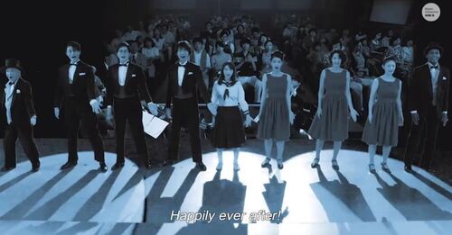还有那个总是弹奏着诡异的钢琴声的老人,则正是大林宣彦本人饰演。他借助旁白传递着他对年轻人的箴言和对于《海边电影院》的阐释:“虽然这是一部奇怪的、现实与幻觉的界线模糊不清的电影,但其中有着我内心的真实情感。如果可以,我想永远地活在这部电影之中。”