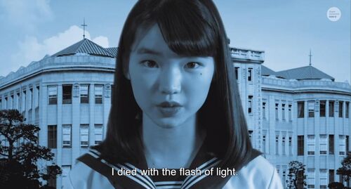 随后,当希子来到影院,时间和空间又同时被打破。大林宣彦让希子穿梭于舞台和银幕的同时,开启了她和影院观众之间关涉“什么是战争”的超时空对话。影像与现实开始共舞,三个青年也莫名地被卷入了这趟穿梭于战争电影的时光旅程之中。