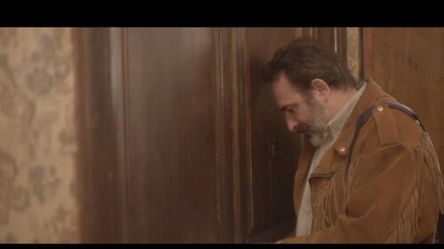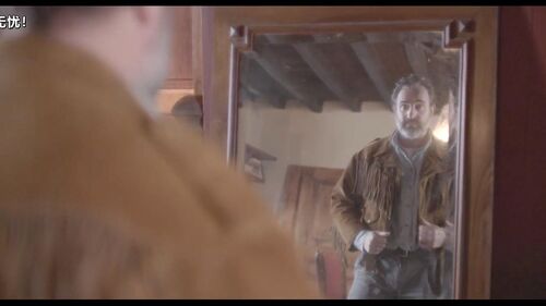 然而事实上,我们错了,伴随着艰难的“开锁”而来的,是一个普通的木制房间:只有镜子,床,台灯,以及头顶的吊扇......观看者的失望暗示着,《鹿皮》绝非某种“无理由”的纯粹快乐,在荒诞动机维持的表象之下,某种确定,严肃的内核正在形成——至少对于导演而言,是更为严肃的自我剖析。