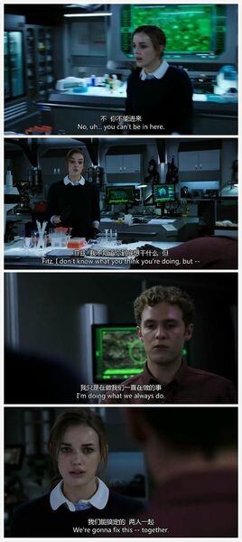 Simmons被病毒感染,二人隔着隔离舱的玻璃互相安慰,最后Fitz还是不顾危险进去陪她: