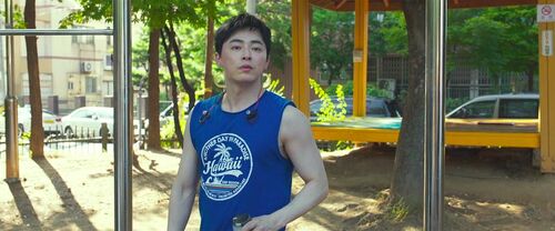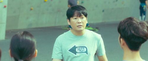 勇男回想起过去跟义珠相识的场景,画面里前辈穿的T恤上就写着“PAST”(过去)