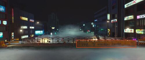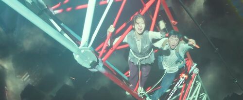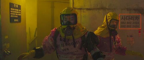 防毒面具时效就快超过时,勇男带着义珠爬上高楼逃生,楼梯转角路过的海报上写着 “拯救女神”;