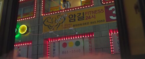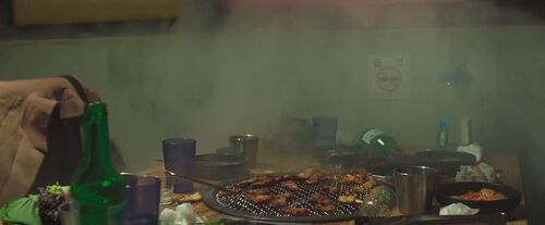 这里的镜头调度很赞,镜头面向男主往下摇,来到了健身房对侧楼下的烤肉店。