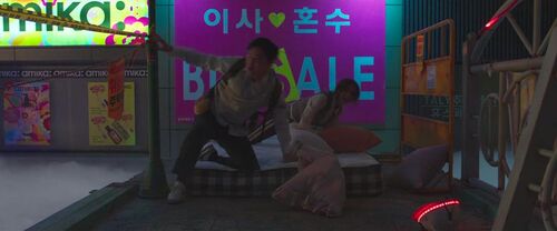 以及在床垫上自由落体的勇男和义珠,暗示了两人未来的爱情线。