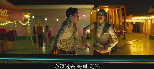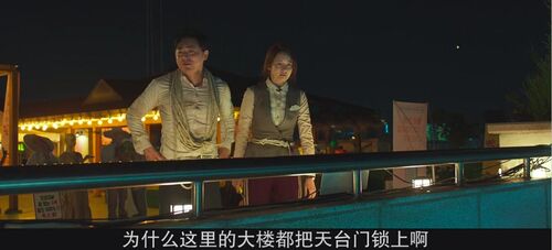 这里在天台发现原来有梯子的情节,轻松幽默地调试了观众紧张的心情,但其实两人刚进入这个天台,导演就已经通过墙上的文字埋下了这里有梯子的伏笔。