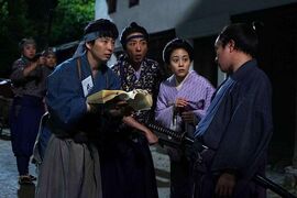 另外还要在介绍一下,饰演鹰村的高桥一生。我在跟他讲戏的时候给他说,“你要演一个超级喜欢看武士电影的武士”,他立刻就明白我说的意思了。因为这个故事发生在江户时期是很和平的年代,武士已经很多年不需要去拔刀砍人了,可我希望他这个角色演出来给人的感觉是,他非常渴望自己成为一名真正的武士,而且他的脑海里应该有很多对真正武士的憧憬,他迫切地想要有一个机会能够实现自己的梦想,所以在中途有人打劫的时候,他就异常的兴奋,感觉自己终于派上用场了。
