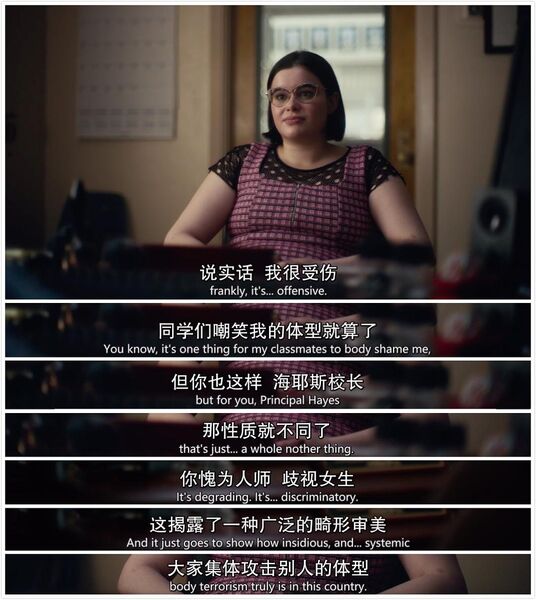 剧中另一个角色Kat Hernandez,反而在女性关于体重、形象、性吸引力自我认知方面的讨论更智慧。