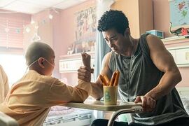 电影前半段喜剧效果很好,后半段体现了世间的温馨。这部电影,巧用反转。一,巧用人设的反差。傻傻的阿爸,光头“任性”女儿。应该是爸爸照顾女儿,但很多时候确实女儿不得不忍受憨憨爸爸。恶狠狡猾的黑社会却展现了憨憨的一面,友爱的一面。二,行为期望的反差。弹幕问,明知道白血病出门很危险,为什么还要自己偷偷出走大邱?原来,是为了给小伙伴送上生日礼物。对他们来说,“下次”是最不喜欢的词。历经万难得到了签名球送给小伙伴,但是,小伙伴在生日这天却依旧住进了隔离病房,前途未卜。三,原因的反差。憨憨爸不受丈母娘待见,有人开头猜测是因为爸是混混打架而耽误了救妈妈。结果,爸爸是消防员救了很多人,而且因为救妈妈吸入太多浓烟大脑缺氧脑供血不足导致大脑不可逆转的受损,妈妈没救回来,但是孩子保住了。虽然就结果看,有点不理解丈母娘,但是她一开始就反对这门亲事,正是因为女儿嫁到大邱才会出这样的事,于是就算女婿最后找到了女儿,也还是难以原谅吧。