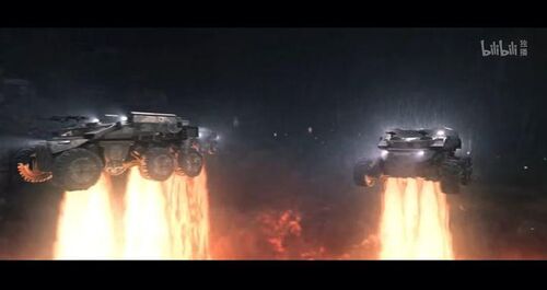 你实在要弄个装甲车直接几千米高空着陆也不是不行,但前提是科幻和科学总得占一个,科幻点的处理方法便可参考下面这个,把轮子改成可收放,至少在下坠着陆前那段轮子不要出来。这样着陆地面突然点火停留空中还想那么回事