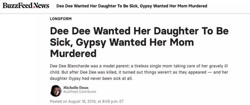 Hulu新剧《恶行》开播,首季将根据Michelle Dean在Buzzfeed上发表的真实故事文章《Dee Dee Wanted Her Daughter To Be Sick, Gypsy Wanted Her Mom To Be Murdered》改编,讲述了一个不知疲倦的单亲妈妈照顾着她重病的女儿,但当Dee Dee被杀后,事情似乎并不是大家看到的这样…