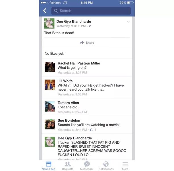 紧接着这条动态下又出现了一条评论:“我他妈的砍了那头肥猪,强奸了她可爱无辜的女儿...她的尖叫声太他妈大声了,哈哈哈!”