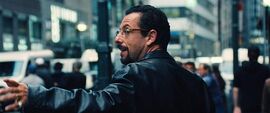这段颇有《2001太空漫游》之风的过渡镜头之后,《原钻》终于来到故事发生的那个具体时空:凯文·加内特在凯尔特人打球,The Weeknd刚崭露头角的2012年,拥挤快节奏的纽约钻石区。故事的主角是钻石商Howard,这个总是穿皮夹克,留着不太标准的胡子,戴钻石耳饰的犹太男人拥有着多重身份。他是纽约钻石区一家小店的老板,是不忠诚的丈夫,是渴望赢得孩子尊敬的父亲,是充满激情的情人,是狂热的NBA粉丝和债务不断的赌徒。