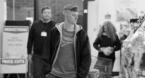 除此之外,青少年们玩耍的破败工厂,杂草丛生的空地,废弃仓库墙上的涂鸦,组成了萧条冷峻的后工业时代影像。而家庭生活图景里的保障性住房,大片雷同的住宅楼,萧索的街区,借由黑白画面,整体传递了后撒切尔时代的工业区中低收入人群被 “劫贫济富” 后的惨淡景象。