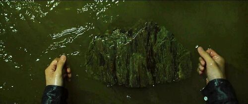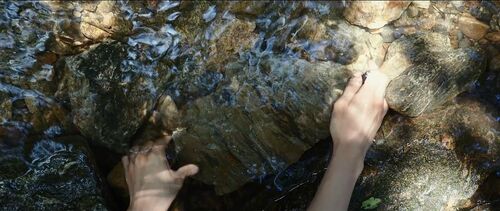 当基宇把石头放回山上小溪,石头却没有浮起来,与前面漂浮场景相悖时,要注意下,这个场景前面的画面是什么?